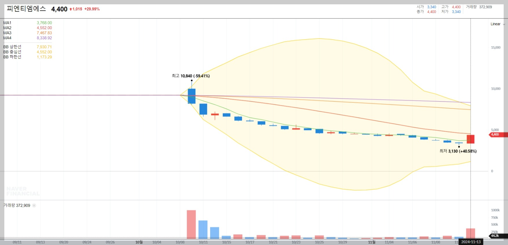 2024년 11월 13일 기준 피엔티엠에스의 주가는 4,400원으로 전일 대비 29.99% 상승했습니다. 이는 최근 급등한 수치로, 거래량도 크게 증가하며 투자자들의 높은 관심을 받고 있습니다.