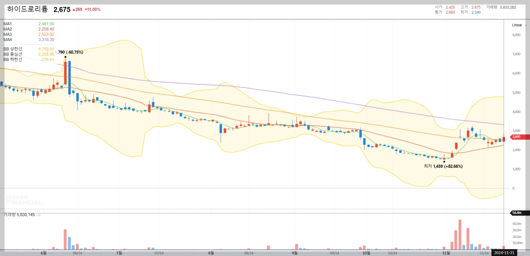 하이드로리튬의 주가는 볼린저 밴드 하단선을 여러 차례 터치한 후 반등세를 보이고 있습니다. 이는 기술적 분석에서 매수 신호로 간주될 수 있으며, 추가 상승 가능성을 시사합니다. 그러나 거래량과 추가 지표를 함께 확인하는 것이 중요합니다.
