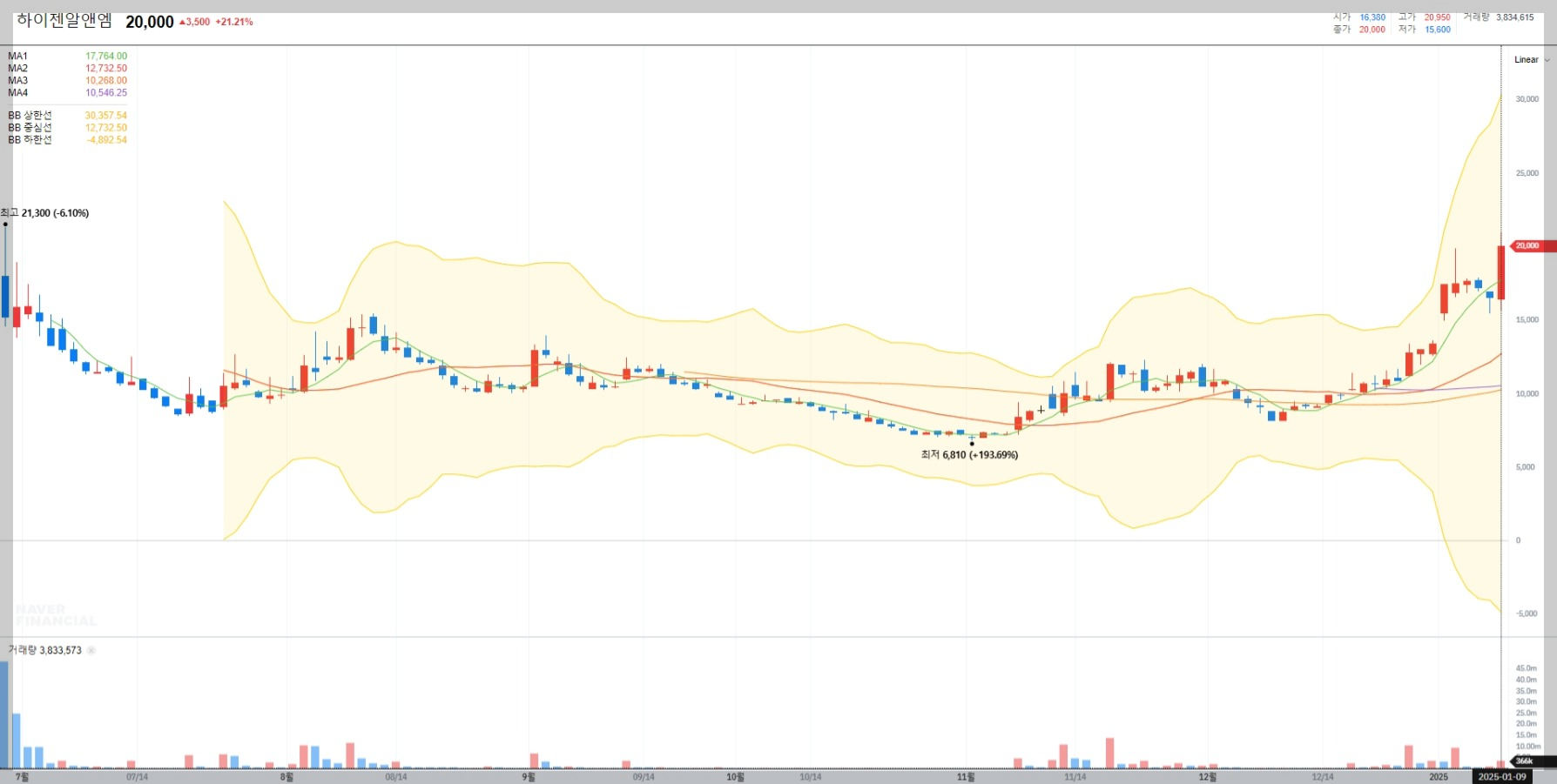 2025년 1월 9일 현재 하이젠알앤엠의 주가는 20,000원으로 전일 대비 21.21% 상승했습니다. 이는 투자자들의 높은 관심을 반영한 결과로 보입니다.