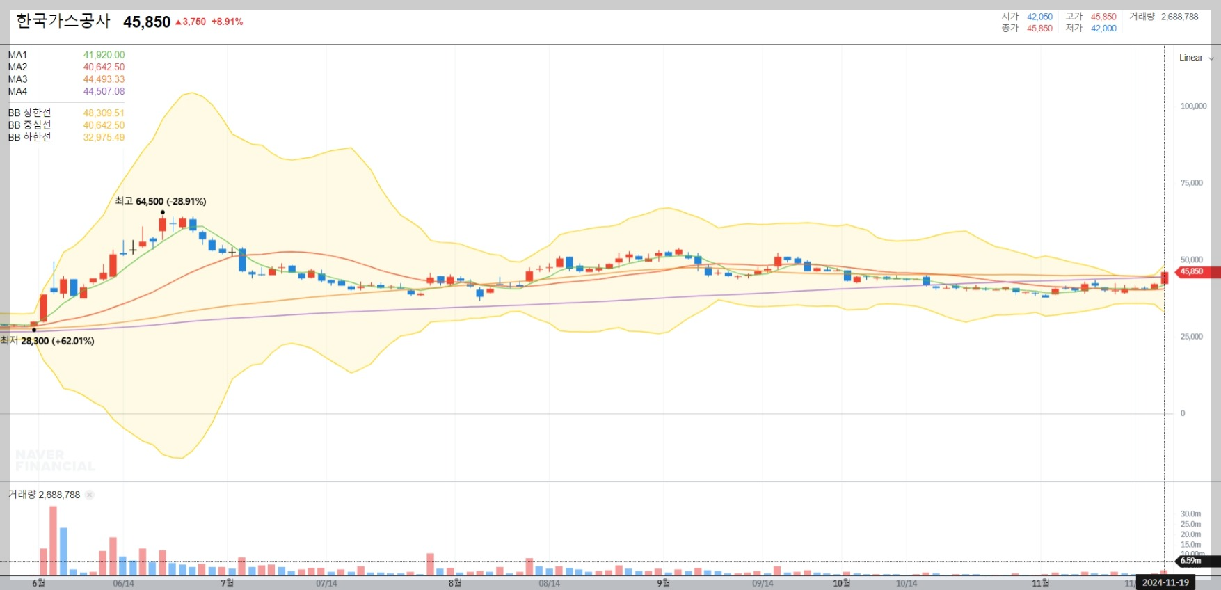2024년 11월 19일 기준으로 한국가스공사의 주가는 45,850원입니다. 이는 전일 대비 8.91% 상승한 수치로, 최근의 급격한 변동성을 반영하고 있습니다. 과거 최고가는 64,500원이었으며 최저가는 28,300원이었습니다.