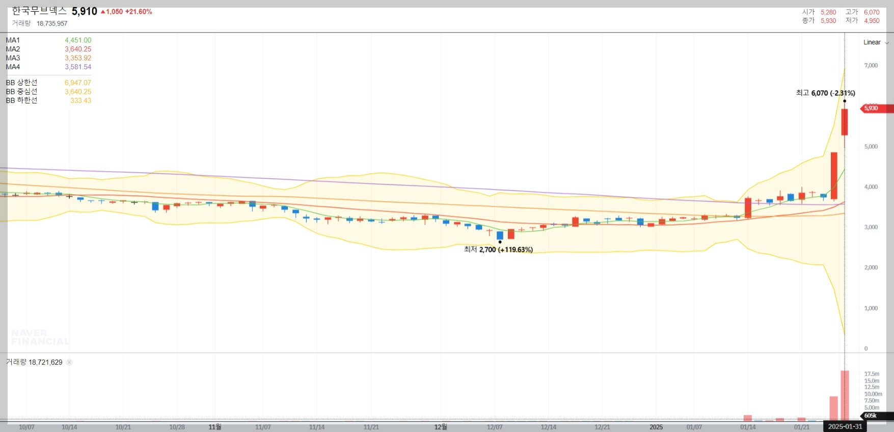 2025년 1월 31일 기준 한국무브넥스의 주가는 5,910원으로 전일 대비 21.60% 상승했습니다. 거래량은 약 18,735,957주로 평소 대비 크게 증가하며 강한 매수세를 보였습니다.