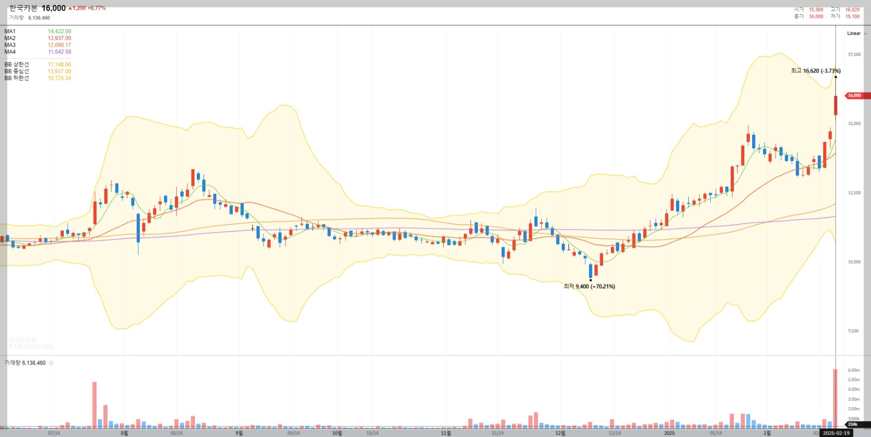 2025년 2월 19일 기준, 한국카본의 주가는 16,000원으로 전일 대비 8.77% 상승하며 강세를 보이고 있습니다. 최근 거래량 증가와 함께 기술적 지표 상에서도 긍정적인 신호를 나타내고 있습니다.