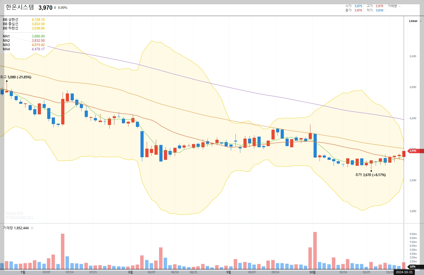 2024년 11월 1일 기준 한온시스템의 주가는 3,970원입니다. 최근 주가는 52주 최저가인 3,670원에서 반등하여 현재 수준에 도달했습니다.