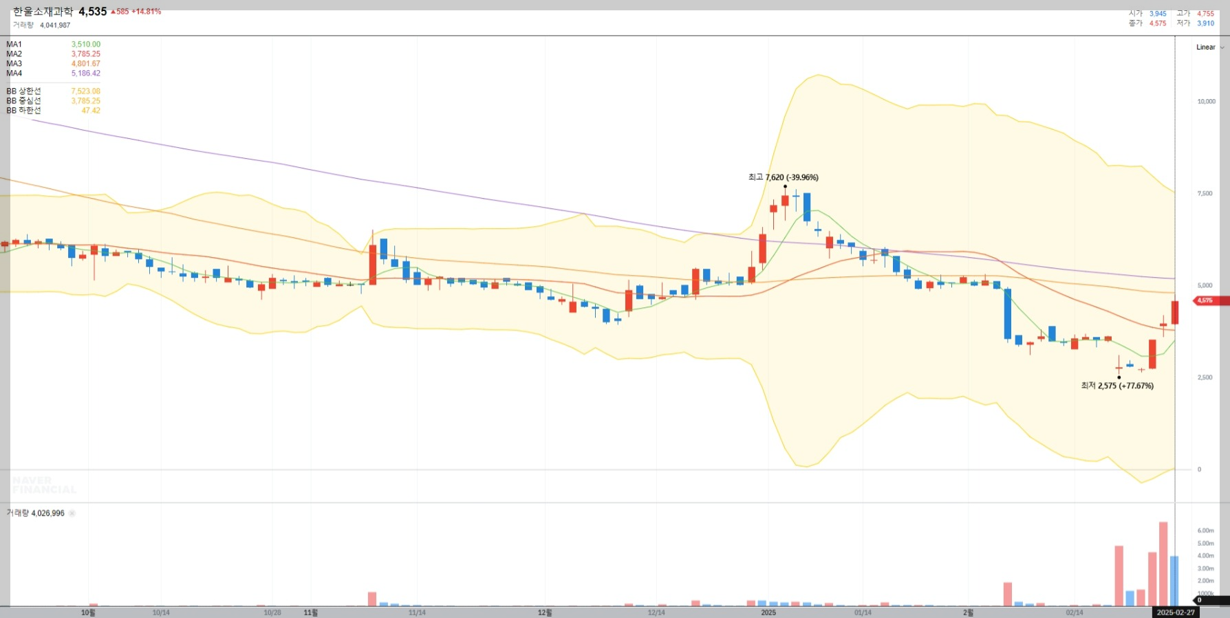 2025년 2월 27일 기준 한울소재과학의 주가는 4,535원으로 전일 대비 14.81% 상승했습니다. 최근 외국인 투자자들의 순매수세와 함께 강한 반등세를 보이고 있습니다.