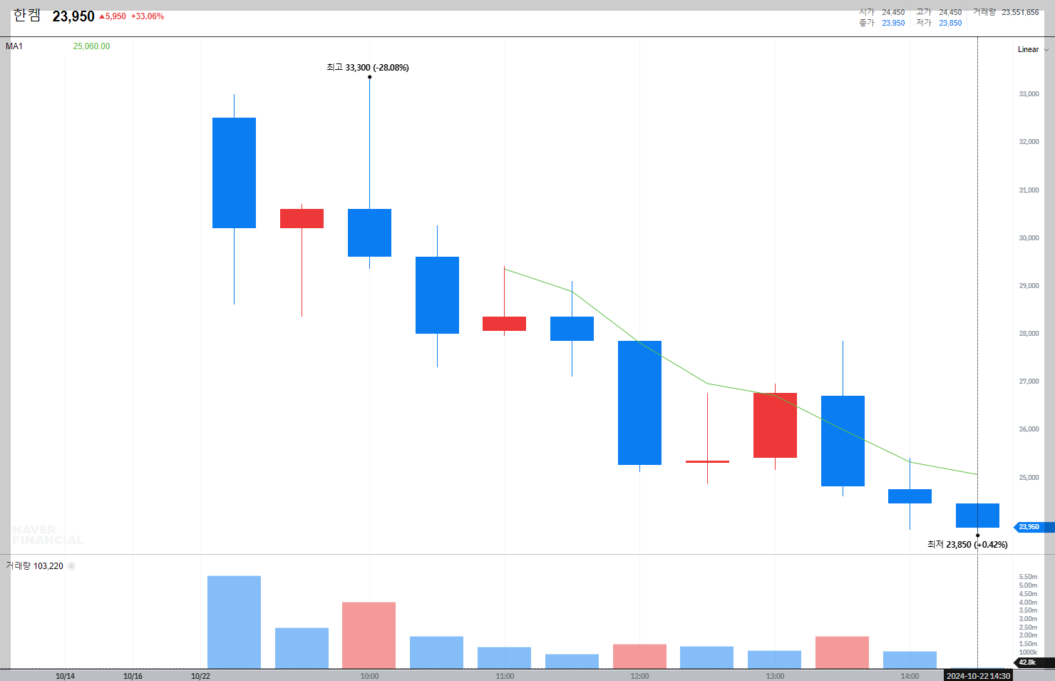 한켐의 주가는 현재 23,950원이며, 상장 첫날의 급등 후 안정세를 유지하고 있습니다.
