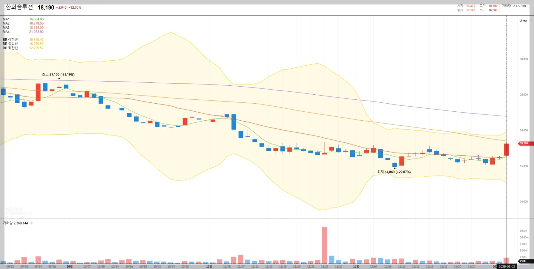 2025년 1월 3일 기준 한화솔루션의 주가는 18,190원으로 전일 대비 12.63% 상승했습니다. 이는 최근 하락세를 벗어나 반등 신호를 보이는 모습입니다. 거래량 또한 약 240만 주로 활발하게 거래되었습니다.