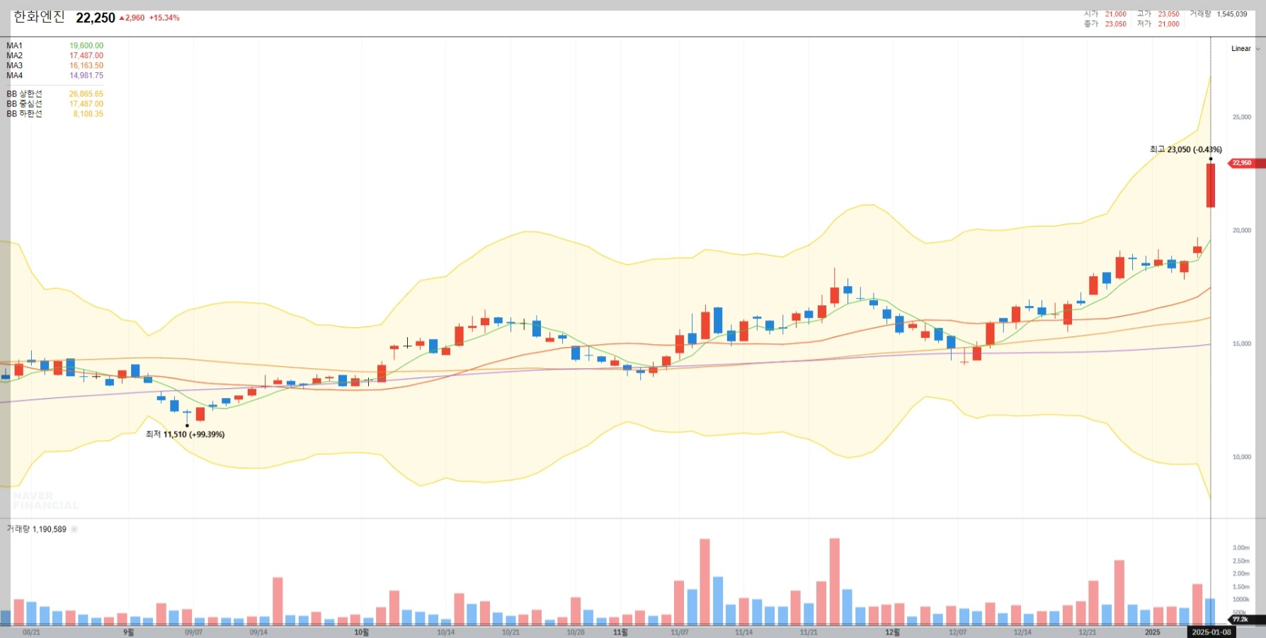 2025년 1월 8일 기준 한화엔진의 주가는 22,250원으로 전일 대비 15.34% 상승했습니다. 거래량 또한 급증하며 투자자들의 관심이 집중되고 있습니다.