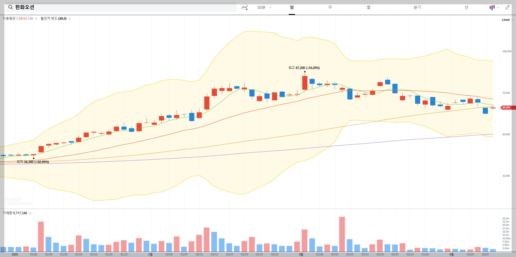 2025년 4월 8일 기준, 한화오션의 주가는 66,400원을 기록하고 있습니다. 전일 대비 3,900원(6.24%) 상승한 수치로, 투자자들의 관심이 집중되고 있음을 알 수 있습니다.