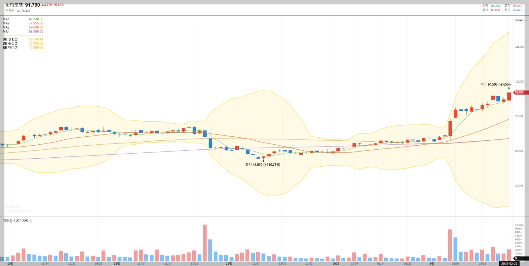 2025년 2월 21일 기준 현대로템의 주가는 91,700원으로 전일 대비 5.40% 상승했습니다. 최근 강한 상승세를 보이며 투자 심리가 크게 개선된 모습입니다.