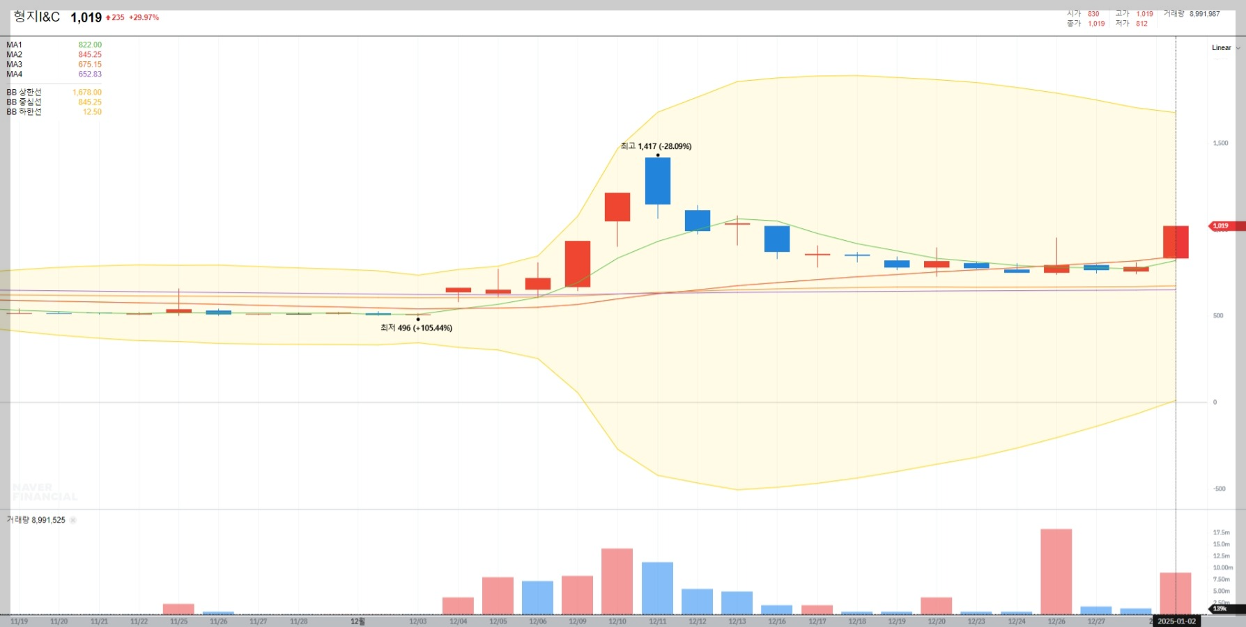 2025년 1월 2일 기준 형지I&C의 주가는 1,019원으로 전일 대비 29.97% 상승했습니다. 이는 최근 한 달간 약 100% 이상 상승한 수치로, 거래량도 급증하며 투자자들의 관심이 집중되고 있습니다.