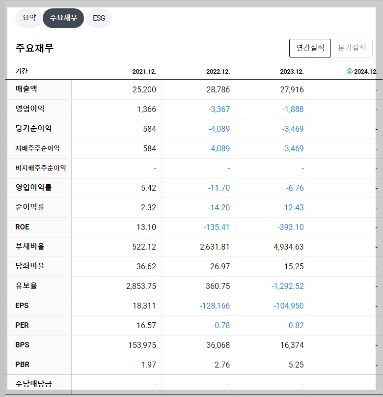 • 높은 부채비율: 2023년 기준 부채비율이 4,934%로 매우 높은 수준입니다.