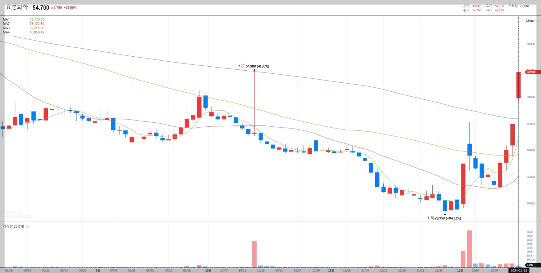 2024년 12월 13일 기준으로 효성화학의 종가는 54,700원으로 전일 대비 21.69% 상승했습니다. 이는 단기적인 매수세와 함께 기술적 반등이 발생했음을 보여줍니다.