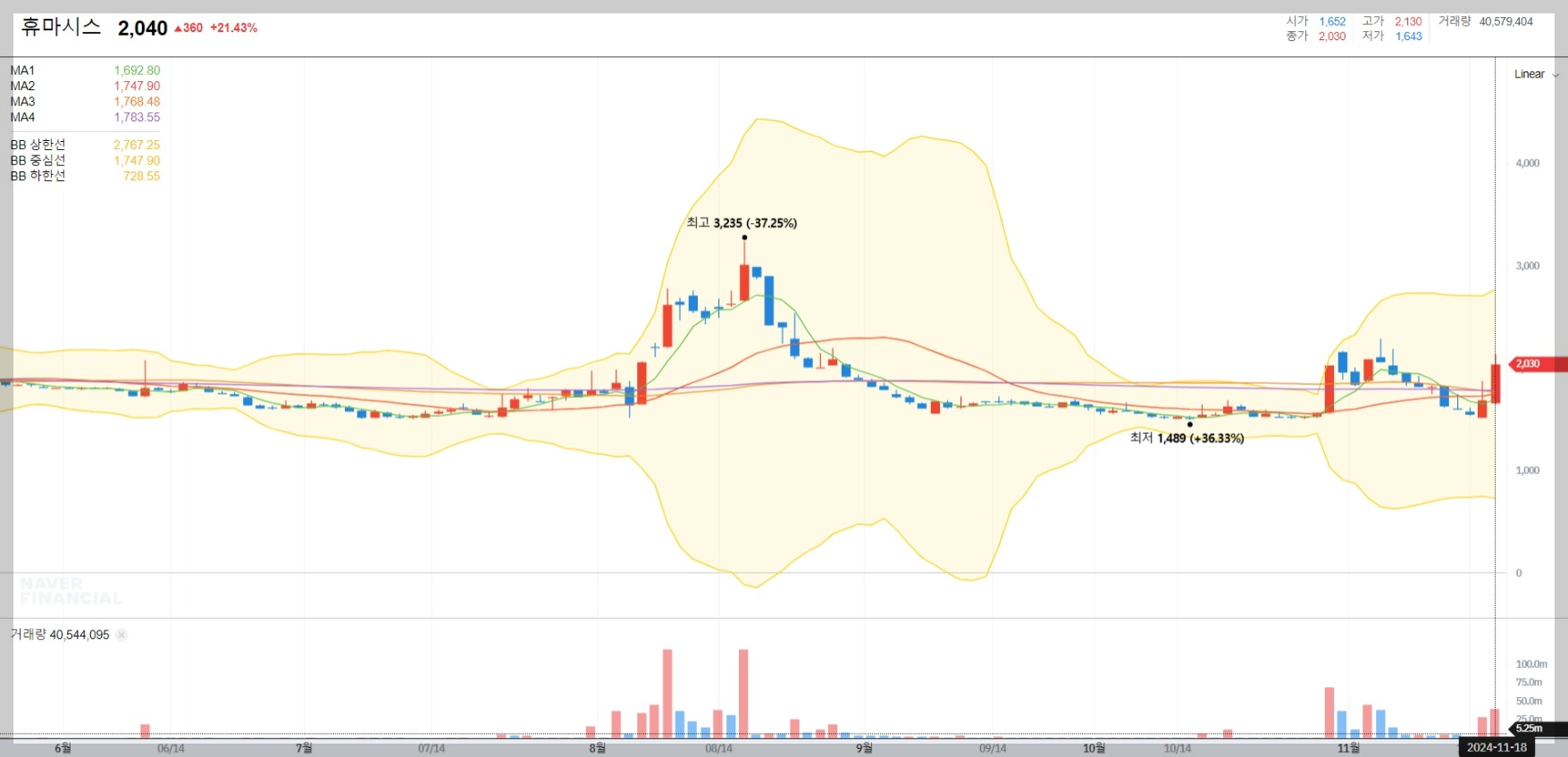 2024년 11월 기준, 휴마시스의 주가는 2,040원으로 전일 대비 21.43% 상승했습니다. 이는 최근의 자사주 매입 발표와 더불어 광산개발 사업에 대한 기대감이 반영된 결과로 보입니다. 그러나 코로나19 엔데믹 이후 기존 사업의 수익성이 악화되면서 장기적인 주가 상승을 기대하기에는 불확실성이 남아있습니다.