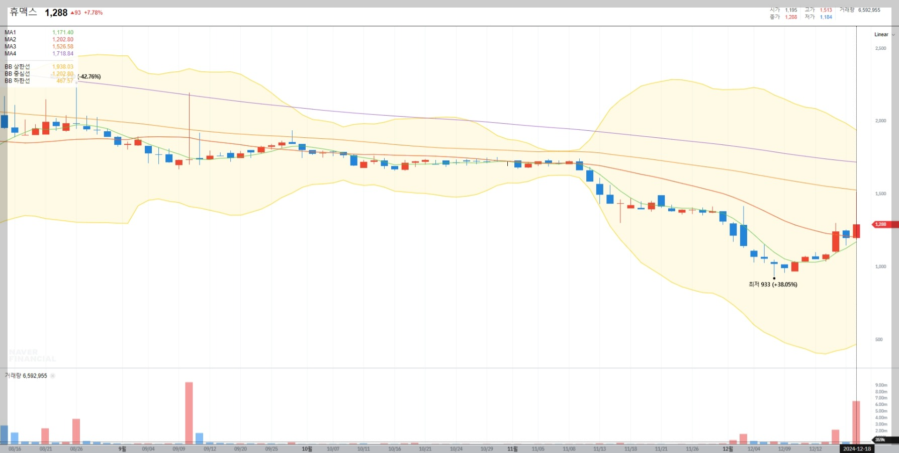 2024년 12월 18일 기준 휴맥스의 종가는 1,288원으로 전일 대비 7.78% 상승했습니다. 최근 저점인 933원에서 반등하며 거래량이 급증한 모습입니다. 이는 기술적 반등 신호로 해석될 수 있습니다.