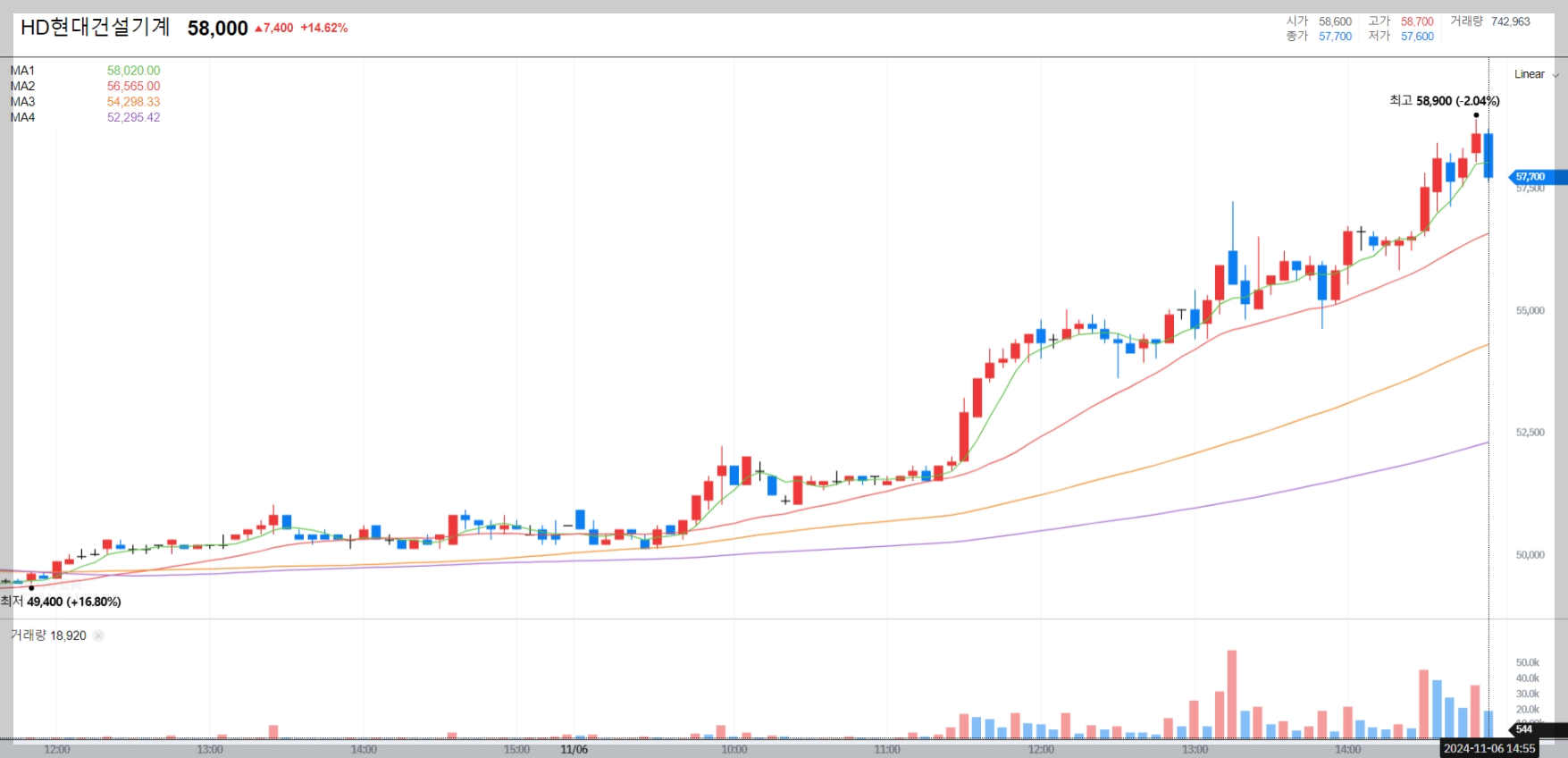 2024년 11월 6일 기준, HD현대건설기계의 주가는 58,000원으로, 최근 52주 최고가는 47,800원, 최저가는 38,200원입니다.