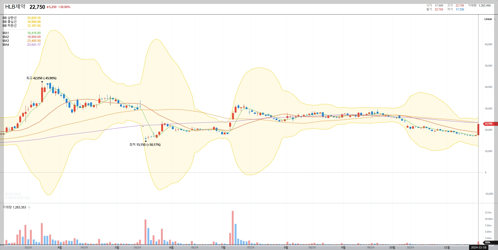 2024년 11월 18일 기준으로 HLB제약의 주가는 22,750원으로 전일 대비 30% 상승했습니다. 이는 최근 FDA 관련 긍정적인 소식이 반영된 결과로 보입니다. 하지만 52주 최고가는 42,050원으로, 여전히 큰 폭의 회복이 필요합니다.