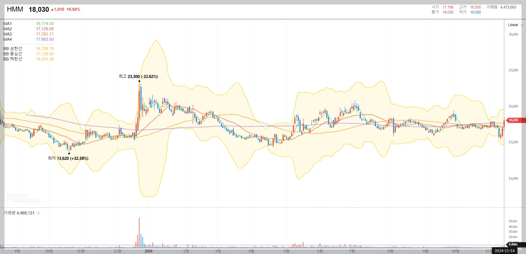 2024년 11월 14일 기준으로 HMM의 주가는 18,030원으로 거래되고 있습니다. 이는 최근 최저점인 13,620원에서 약 32% 상승한 수치입니다. 그러나 최고점인 23,300원 대비로는 여전히 낮은 수준입니다. 이러한 변동성은 투자자들에게 기회와 리스크를 동시에 제공하고 있습니다.