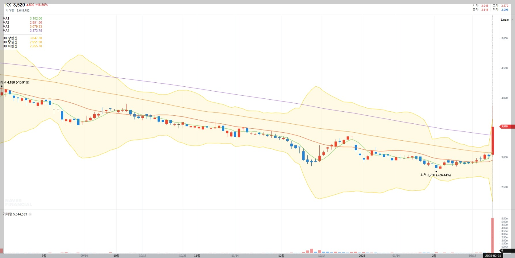2025년 2월 21일 기준 KX의 주가는 3,520원이며, 전일 대비 16.56% 상승했습니다. 단기적으로 볼린저밴드 상단을 돌파하며 강한 상승세를 보였으나 과매수 구간에 진입한 것으로 보입니다.