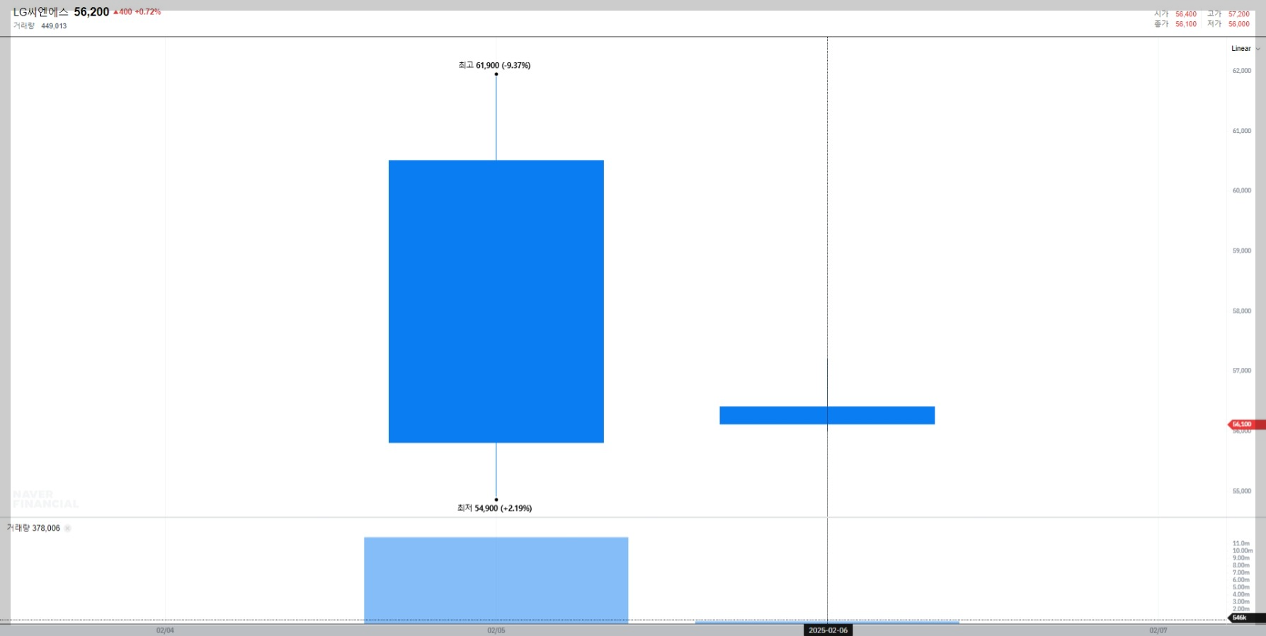 2025년 2월 6일 기준 LG씨엔에스의 현재 주가는 56,200원으로 전일 대비 0.72% 상승했습니다. 거래량은 449,013주로 활발한 거래를 보였습니다. 최근 고점은 61,900원으로 기록되었으며, 이는 단기적으로 강한 저항선이 될 가능성이 있습니다.