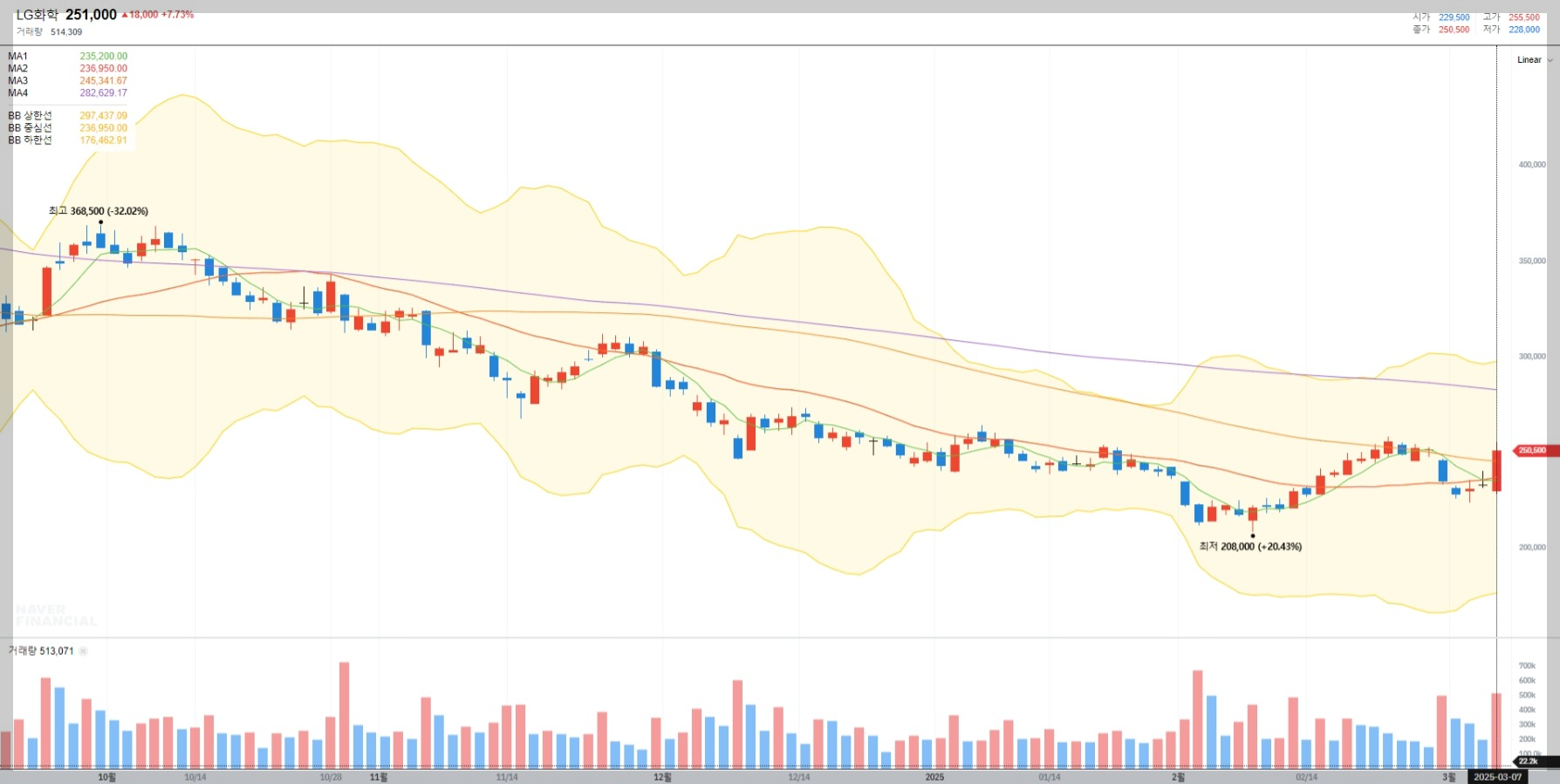2025년 3월 기준 LG화학의 현재 주가는 251,000원으로 최근 상승세를 보이고 있습니다. 하지만 글로벌 경기 침체와 석유화학 업황 부진이 지속되고 있어 변동성이 예상됩니다.