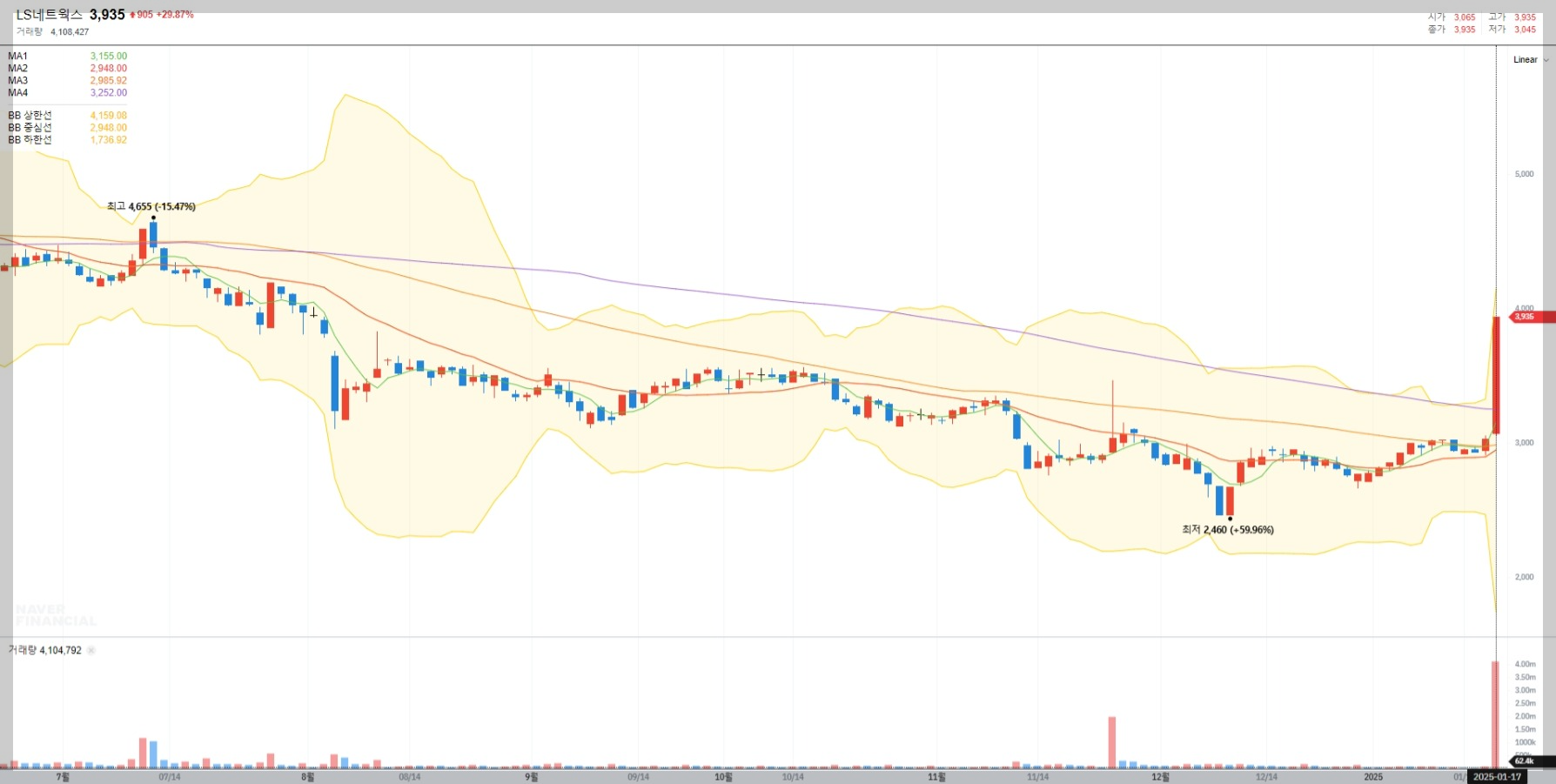 2025년 1월 17일 기준 LS네트웍스의 주가는 3,935원으로 전일 대비 약 29.87% 상승했습니다. 이는 최근 발표된 긍정적인 실적과 투자자들의 기대감이 반영된 결과로 보입니다.