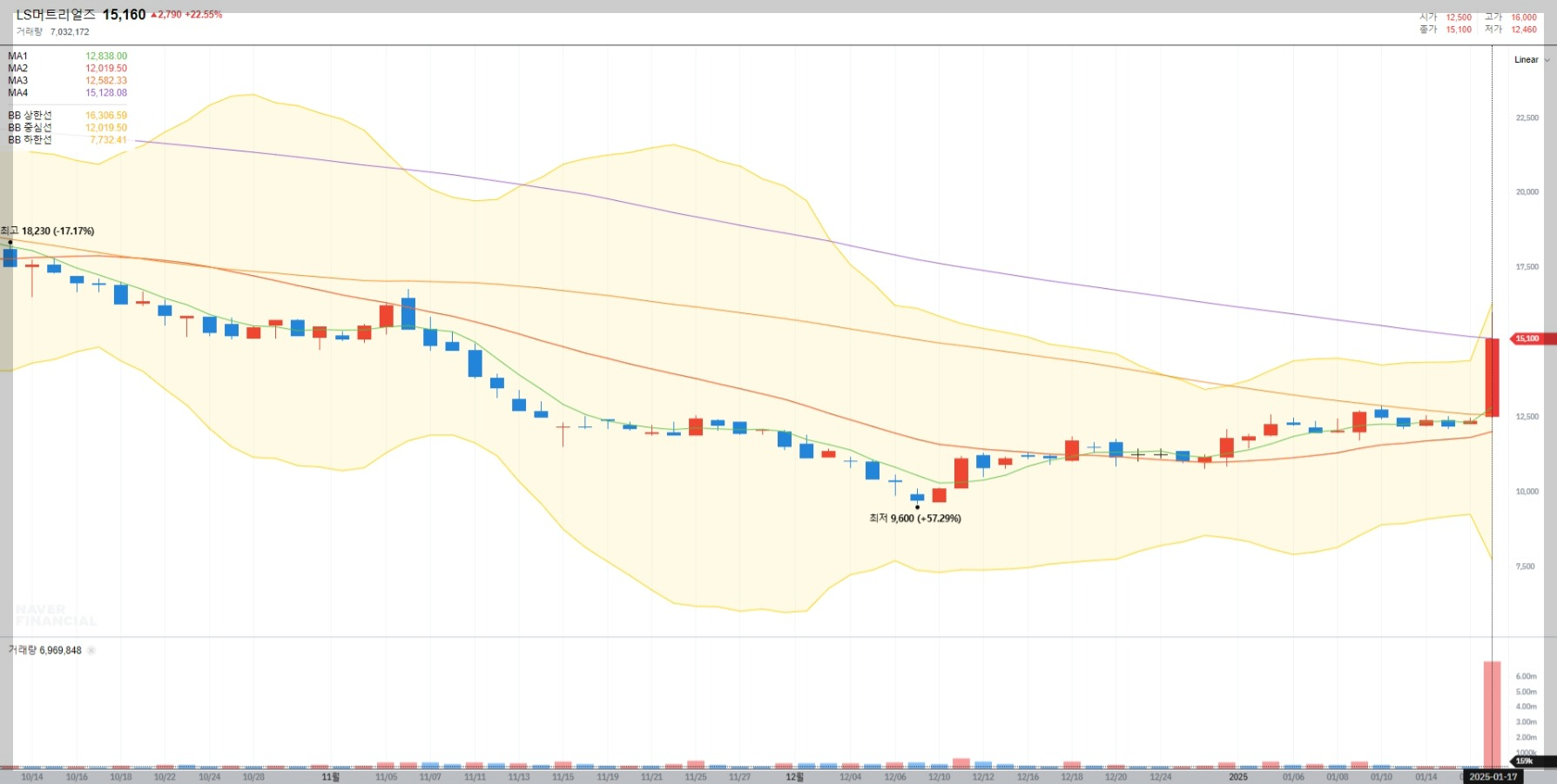 2025년 1월 17일 기준 LS머트리얼즈의 주가는 15,160원으로 전일 대비 22.55% 상승하며 강력한 상승세를 보였습니다. 이는 최근 발표된 실적 개선 및 긍정적인 시장 전망에 따른 것으로 보입니다.
