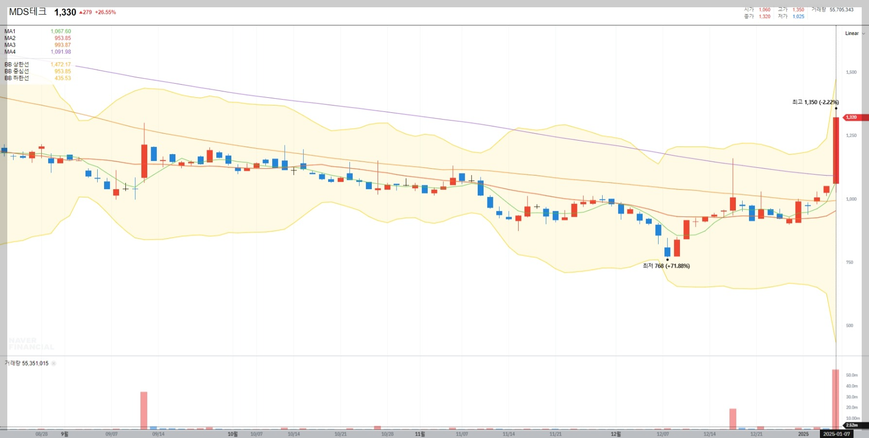 2025년 1월 7일 기준 MDS테크의 주가는 1,330원으로 전일 대비 26.55% 급등했습니다. 이는 CES 2025 기대감과 엔비디아와의 협력 강화 소식이 반영된 결과로 보입니다.