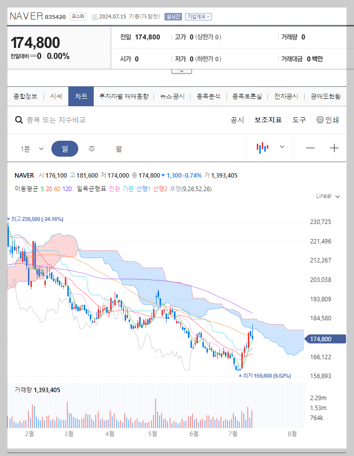 NAVER 현재 주가는 174,800원이며 전일 대비 1,300원의 하락한 모습을 보이고 있습니다. NAVER의 주주현황을 살펴보면 국민연금공단 주주가 전체 지분 8.23%를 소유하고 있습니다. NAVER는 인터넷 서비스 기업으로 장중 기준으로 주가는 174,800원입니다. NAVER의 시가 총액은 28조 3890억 원이며 발행 주식수는 162,408,594주입니다. 외국인 보유 비중은 43.92%이며 장중 거래량은 1,393,405원 을 기록했습니다. 매출액은 25,261억 원을 달성했습니다. EPS는 8,983원이며 NAVER 주식 배당수익률은 0.69%입니다.