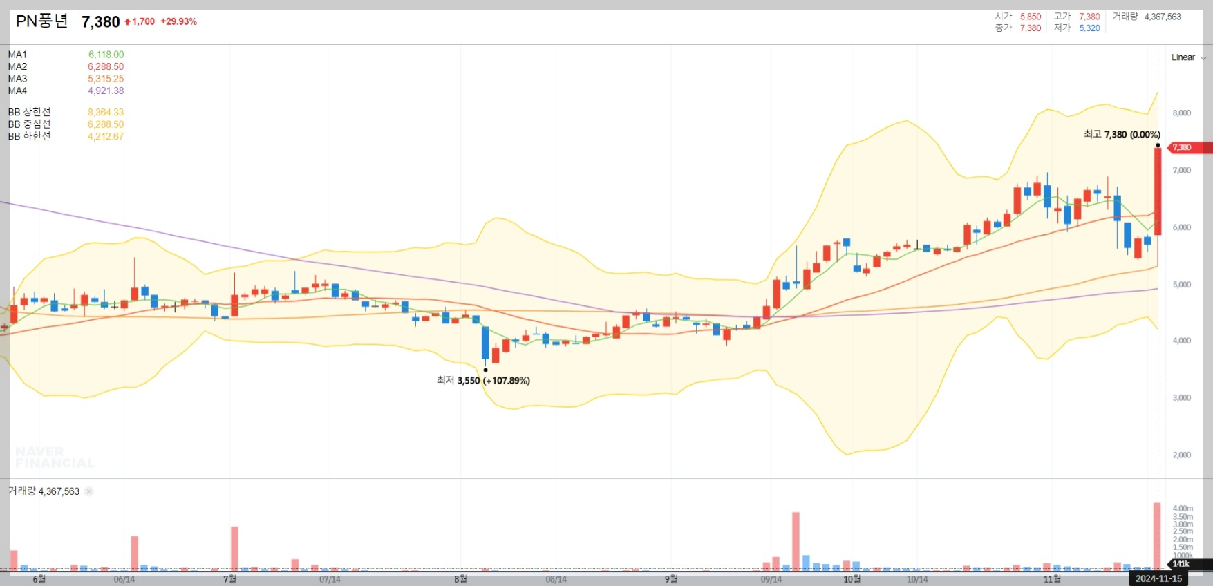 2024년 11월 15일 기준으로 PN풍년의 주가는 7,380원에 거래되고 있으며, 이는 전일 대비 29.93% 상승한 수치입니다. 최근 몇 개월간의 주가 흐름을 보면 안정적인 상승세를 보이고 있으며, 특히 최근의 급등은 거래량의 증가와 함께 나타났습니다.