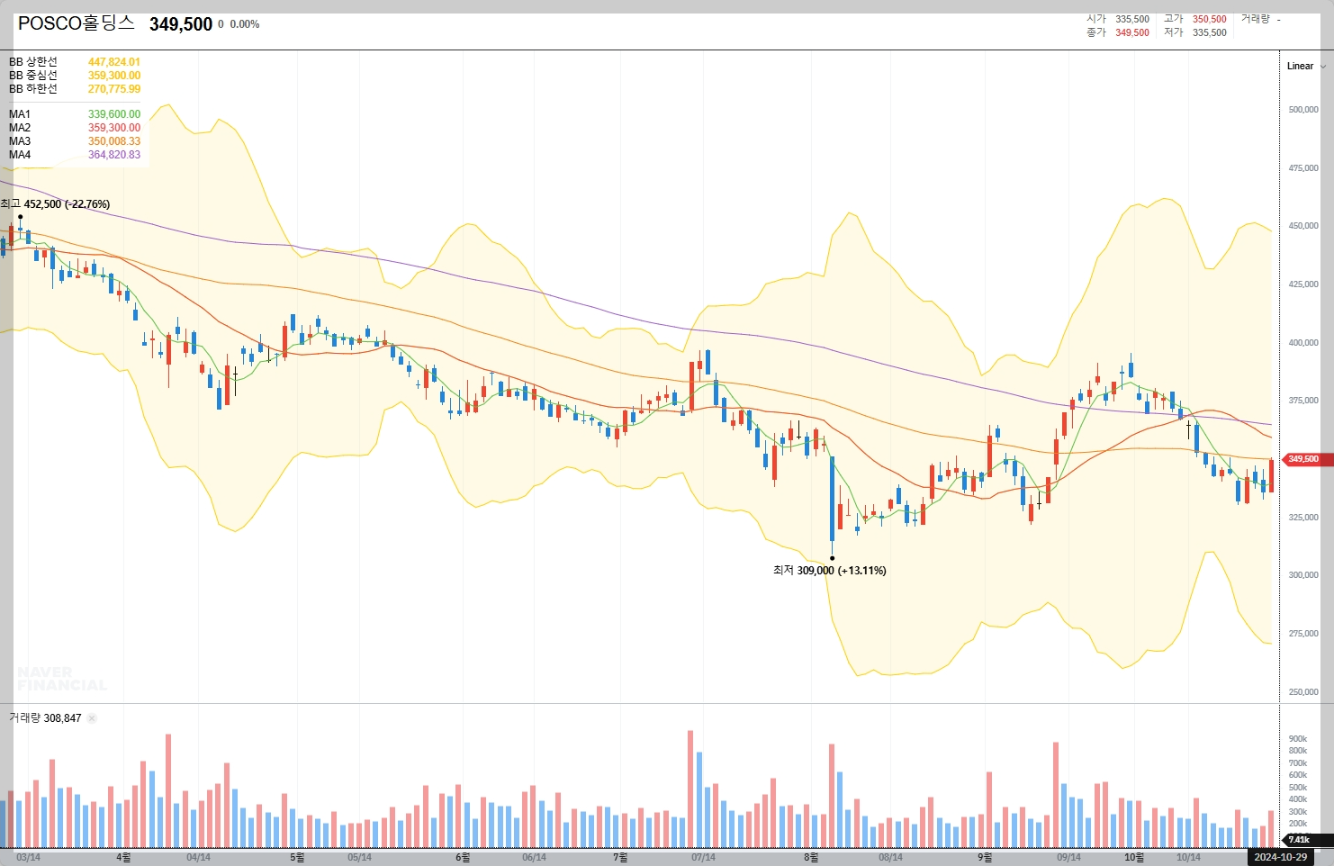 2024년 10월 29일 기준으로 POSCO홀딩스의 주가는 349,500원입니다. 최근 주가는 335,500원에서 349,500원 사이에서 변동하고 있습니다.