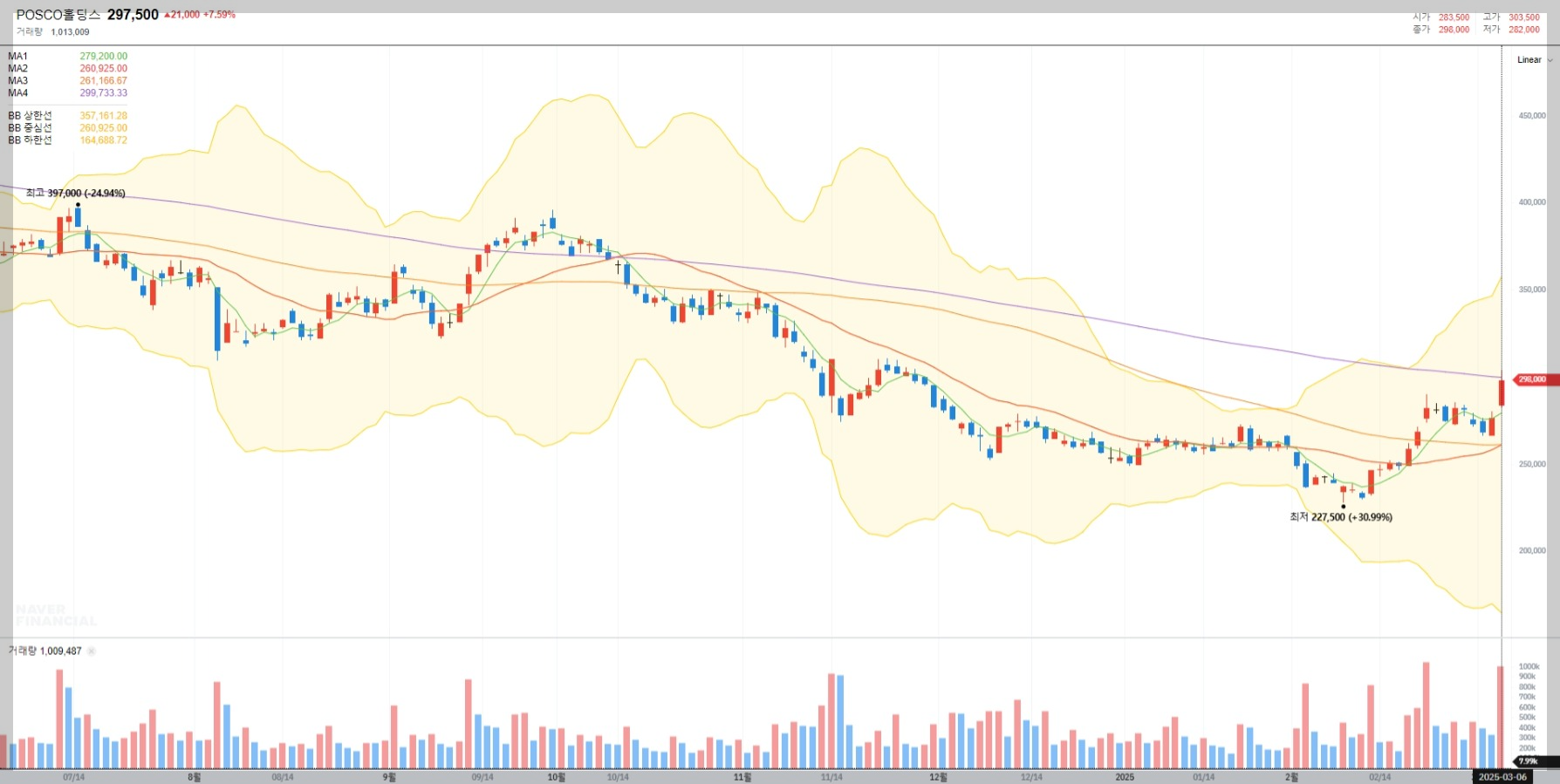 2025년 3월 6일 기준 POSCO홀딩스의 주가는 297,500원으로 최근 상승세를 보이고 있습니다. 볼린저밴드 상단에 근접한 상태로 단기적인 과매수 신호를 나타내고 있습니다.