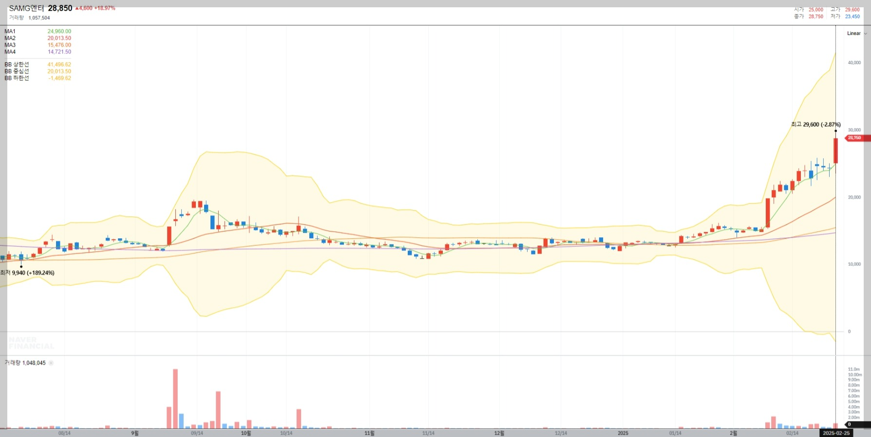2025년 2월 25일 기준 SAMG엔터의 주가는 28,850원으로 전일 대비 18.97% 상승했습니다. 최근 몇 달간 급격한 상승세를 보이며 투자자들의 관심을 끌고 있습니다.