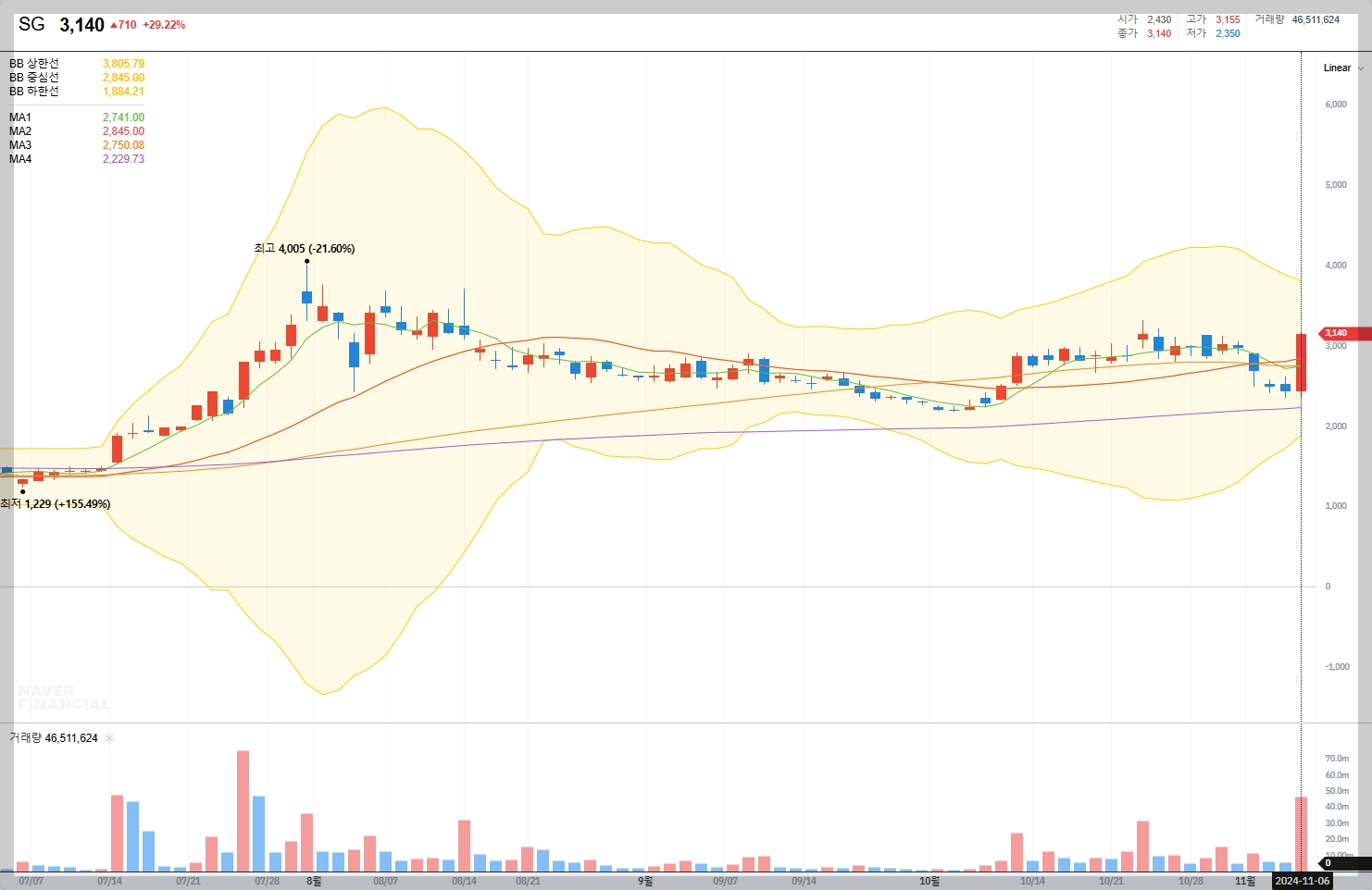 2024년 11월 7일 기준, SG의 주가는 3,140원으로 전일 대비 29.22% 상승했습니다.