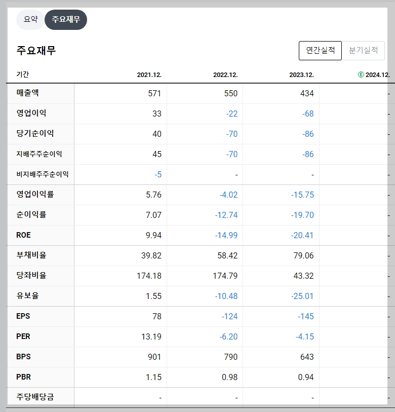 • 2023년 매출액: 434억 원 (-21% YoY)