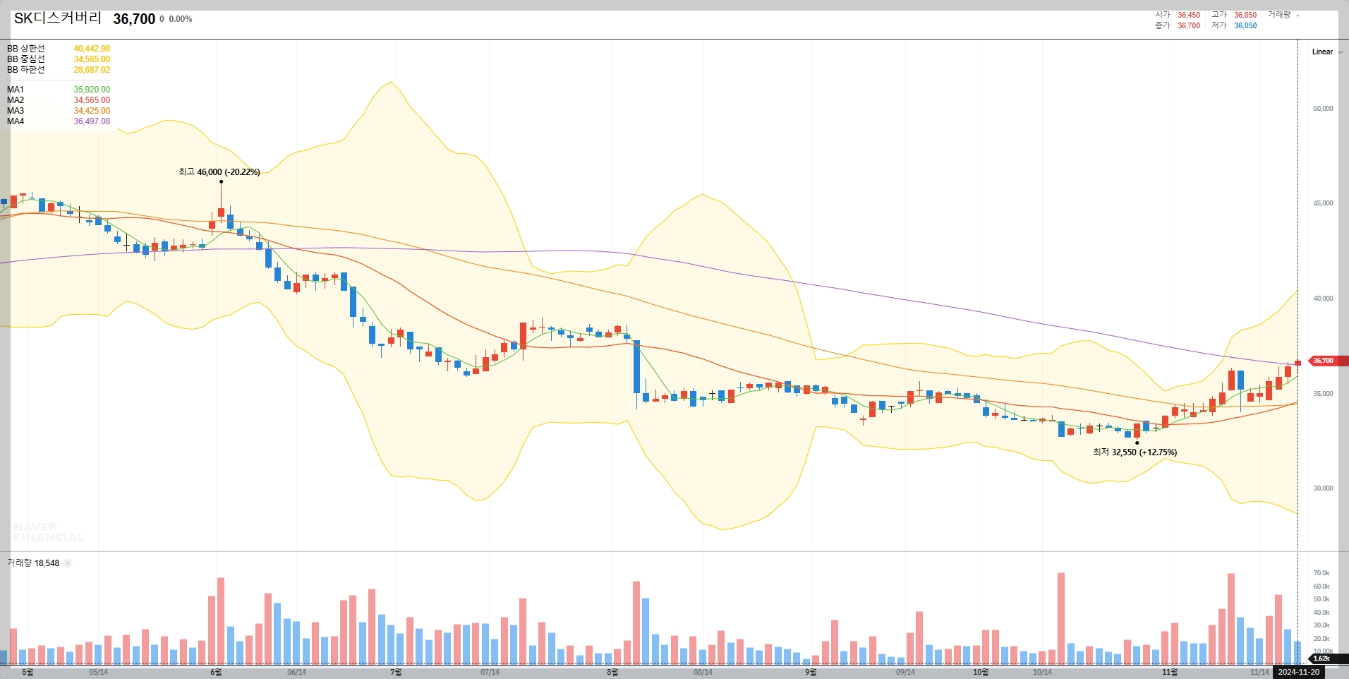 현재 SK디스커버리의 주가는 약 36,700원으로 최근 상승세를 보이고 있습니다. 연초 대비 하락세를 보였으나 최근 반등하며 안정적인 흐름을 유지하고 있습니다.