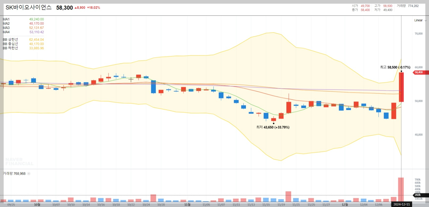 2024년 12월 11일 기준, SK바이오사이언스의 주가는 58,300원으로 전일 대비 18.02% 상승했습니다. 이는 단기적인 기술적 반등으로 보이며, 거래량 또한 급증하여 투자자들의 관심을 모으고 있습니다.