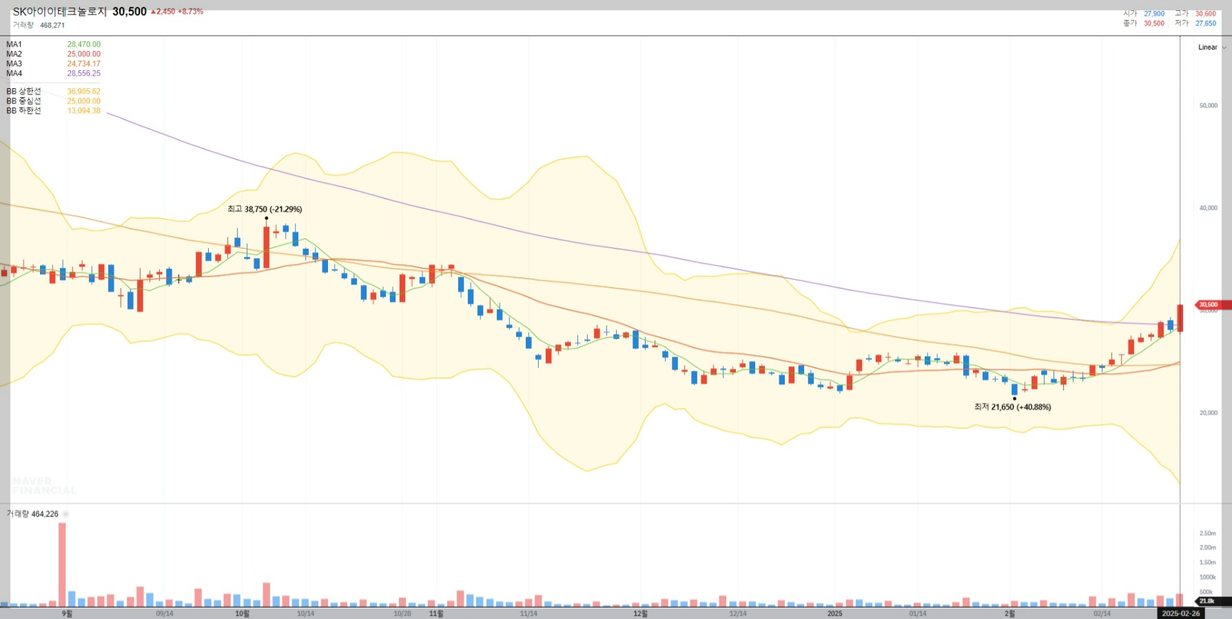 2025년 2월 26일 기준 SK아이이테크놀로지의 주가는 30,500원으로 전일 대비 8.73% 상승했습니다. 최근 저점인 21,650원에서 약 40% 이상 반등하며 강한 상승세를 보이고 있습니다.