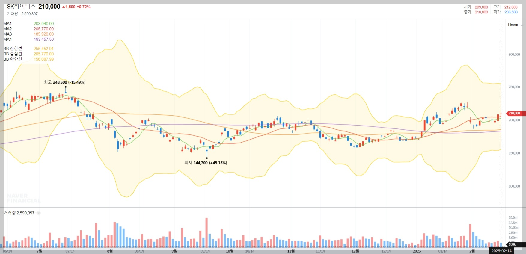2025년 2월 15일 기준 SK하이닉스의 주가는 210,000원으로 거래되고 있습니다. 최근 한 해 동안 최저 144,700원에서 최고 248,500원을 기록하며 변동성을 보였습니다.