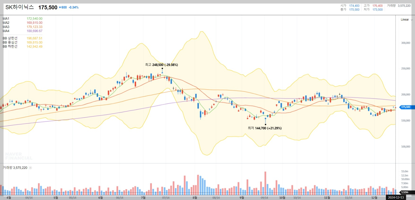 2024년 12월 13일 기준, SK하이닉스의 종가는 175,500원으로 최근 저점인 144,700원 대비 약 21% 상승했습니다. 그러나 연초 고점인 248,500원에 비해 여전히 낮은 수준입니다.