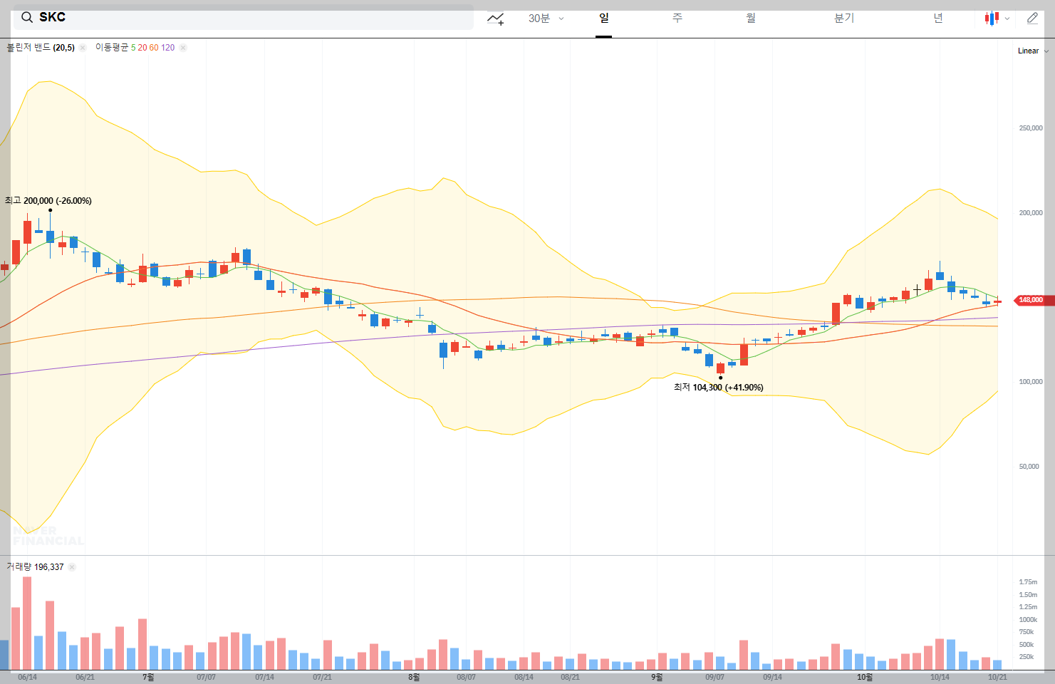 볼린저밴드 매매기법을 통해 SKC의 주가 변동성을 분석해보면, 최근 주가가 상단 밴드를 돌파하며 강한 상승세를 보이고 있습니다. 이는 추가적인 상승 가능성을 시사합니다.