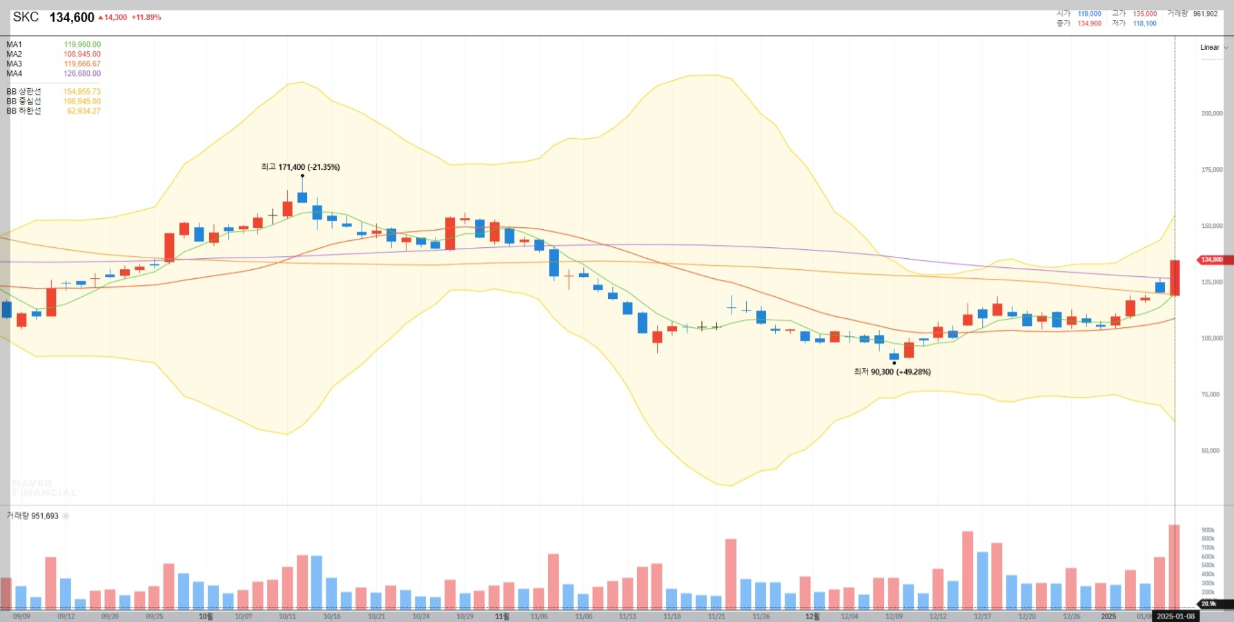 2025년 1월 8일 기준 SKC의 주가는 134,600원으로 전일 대비 11.89% 상승했습니다. 최근 거래량 증가와 기술적 반등이 나타나고 있어 투자자들의 관심이 집중되고 있습니다.