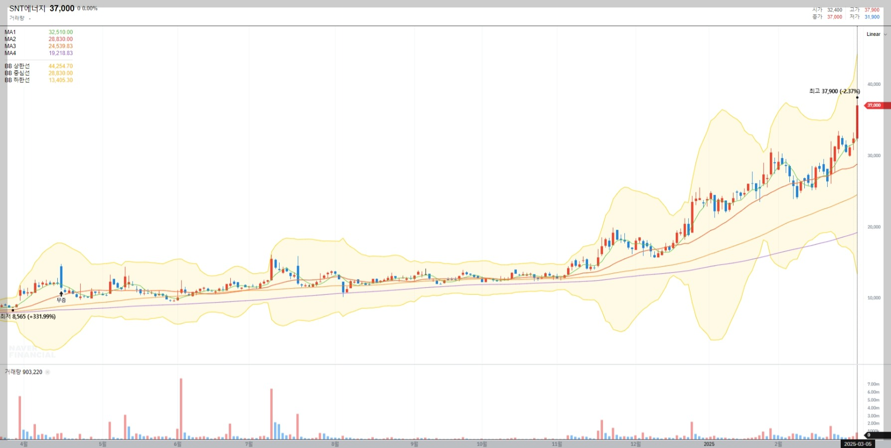 SNT에너지의 현재 주가는 37,000원으로 최근 몇 달간 강한 상승세를 보이고 있습니다. 이는 신규 수주 증가와 증권사들의 긍정적인 목표주가 상향 조정이 주요 요인으로 작용했습니다.