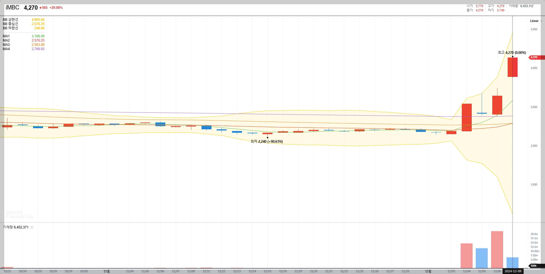현재 iMBC의 주가는 4,270원으로 전일 대비 29.98% 상승했습니다. 이는 거래량 증가와 함께 강한 매수세가 유입된 결과로 보입니다. 단기적으로 과열 신호도 감지되지만, 상승 모멘텀이 유지되고 있습니다.